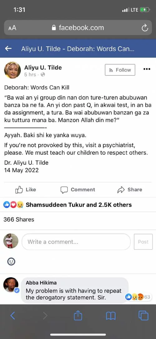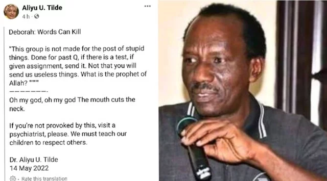 The Bauchi State Commissioner for Education, Dr. Aliyu Tilde, has backed the gruesome murder of Deborah Samuel, a female student of the Shehu Shagari College of Education, Sokoto State, by her colleagues over alleged blasphemy.