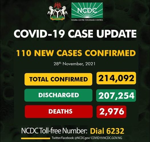 On the 28th of November 2021, 110 new confirmed cases and 1 death were recorded in Nigeria