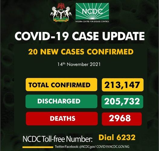 On the 14th of November 2021, 20 new confirmed cases and 8 deaths were recorded in Nigeria
