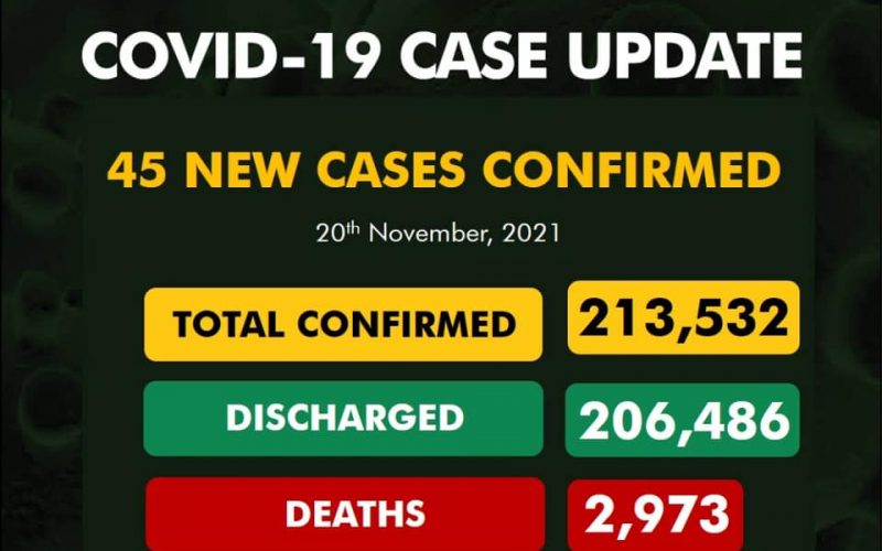 On the 20th of November 2021, 45 new confirmed cases were recorded in Nigeria