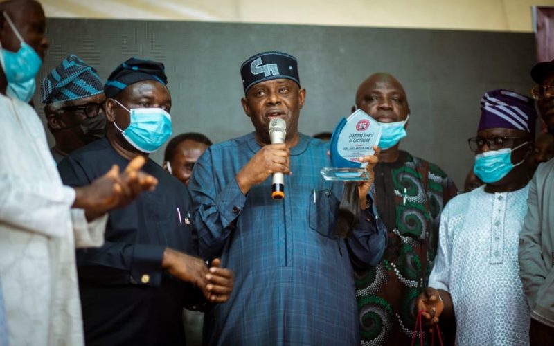 Joining the Hon commissioner to receive the award on behalf of the Governor were Rt. Hon James Abiodun Faleke,Alh Dally Adeokun,Dr Mojeed Alabi Balogun,Hon Dotun Olakanle,Hon Bunmi Oluyadi,Chief Akinsanya and Hon Balogun.