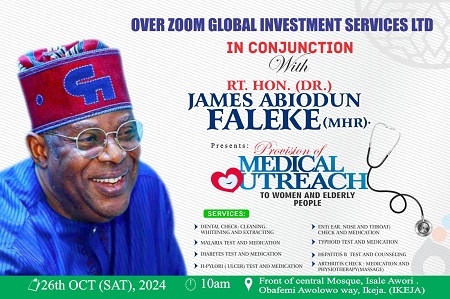 As part of his constituency initiatives, Rt. Hon James Abiodun Faleke, Honourable Member of the House of Representatives for Ikeja Federal Constituency, is hosting a free medical outreach on Friday, Saturday, and Sunday.