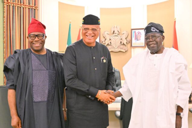 President Bola Tinubu on Friday received Akwa Ibom State Governor, Pastor Umo Eno, and Senate President Godswill Akpabio at the Presidential Villa, Abuja.