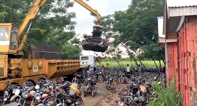 These motorcycles impounded by the Lagos State Task Force are being crushed in an undisclosed location in the state, said Mr Gboyega Akosile who is the Chief Press Secretary to the state governor, Babajide Sanwo-Olu.