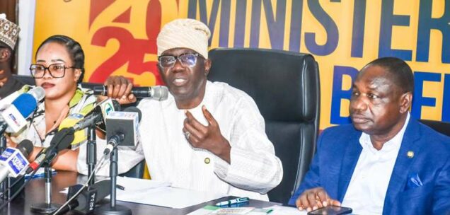 From left, Special Adviser to the Governor on Housing, Barr. Barakat Oduniga-Bakare; Lagos State Commissioner for Housing, Mr Moruf Akinderu-Fatai and Lagos State Commissioner for Information and Strategy, Mr Gbenga Omotoso during the Lagos State Government Year 2025 Ministerial Press Briefing by the Ministry of Housing in Lagos on Tuesday