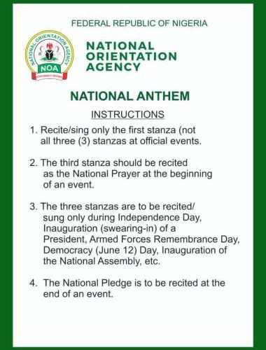 The National Orientation Agency (NOA) has issued a public notice clarifying the correct procedure for the rendition and recitation of Nigeria’s National Anthem and National Pledge during official and national events.