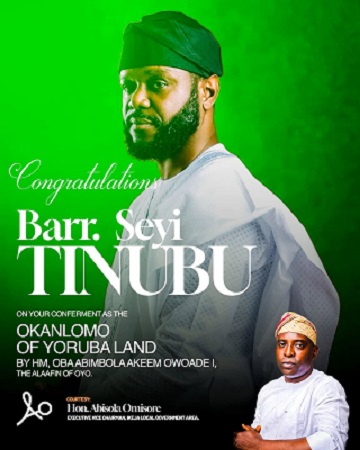 In a ceremony steeped in tradition and regal pageantry, Barrister Seyi Ahmed Tinubu, son of President Bola Ahmed Tinubu, has been officially conferred with the prestigious chieftaincy title of Okanlomo of Yorubaland by the Alaafin of Oyo, Oba Akeem Owoade.