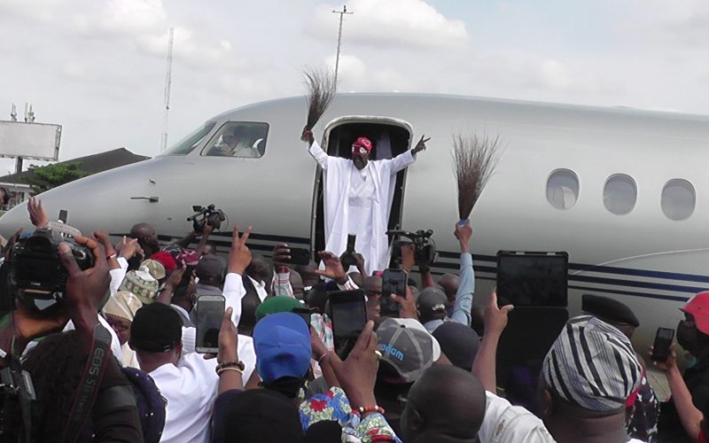 The eager cheering crowd waited patiently for Tinubu at the airport, who upon disembarking from the airplane, waved at them, boarded a waiting bus and headed for the palace of Oba of Lagos, Rilwan Akiolu.
