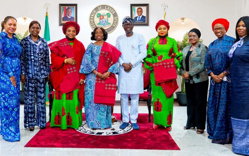 Lagos State Governor, Mr. Babajide Sanwo-Olu (middle); First Lady of Lagos State, Dr. (Mrs) Ibijoke Sanwo-Olu (fourth left); President, Nigerian Army Officers’ Wives Association, NAOWA/wife of the Chief Of Army Staff, Mrs. Salamatu Yahaya (third left); Special Adviser to the Governor on SDGs & Investment, Mrs. Solape Hammond (left); wife of Grand Officer Commanding, GOC 81 Division, Mrs. Oghenerukvewe Fejoku (fourth right); Secretary to the Lagos government, Mrs. Folasade Jaji (third right); Commissioner for Women Affairs & Poverty Alleviation, WAPA, Mrs. Bolaji Dada (second right) and members of NAOWA, during NAOWA’s courtesy call on the Governor, at the Lagos House, Marina, on Thursday, January 27, 2022.