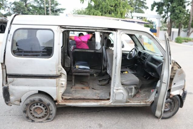 Police immediately intercepted the unregistered vehicle, which has been confirmed as the syndicate’s operational bus. Items recovered at the scene included a Tecno Spark 20 smartphone stolen from a victim, an axe, two concrete interlock bricks, several heavy stones, and a broken bottle crude weapons allegedly used to assault and intimidate passengers during past operations.